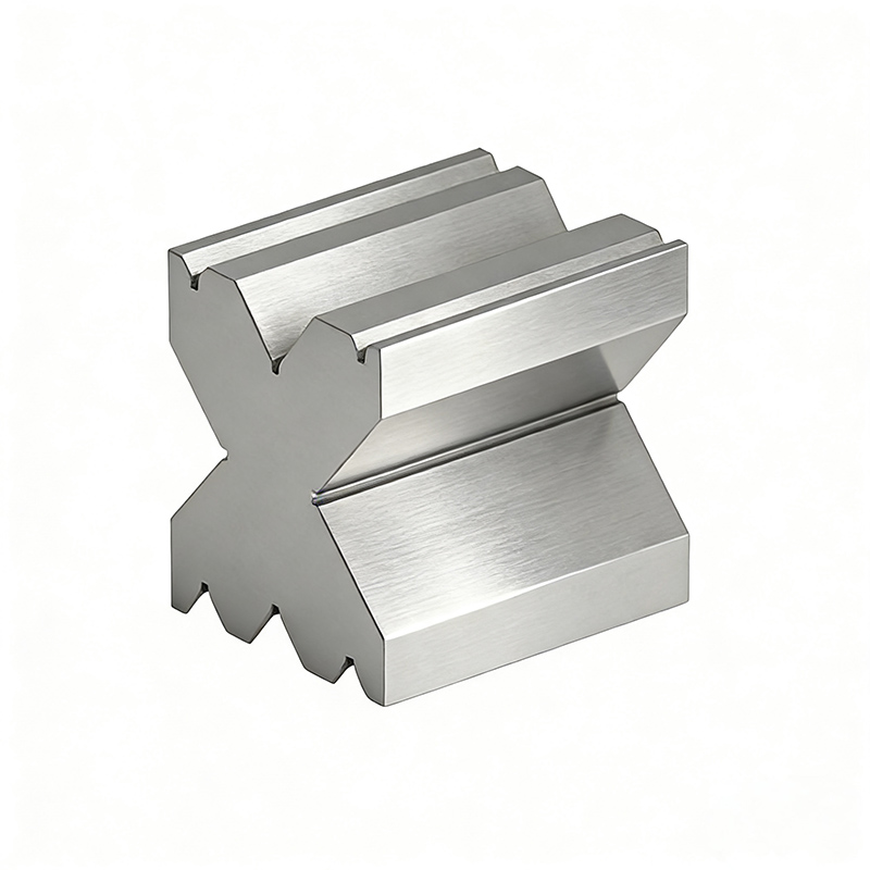The four sides feature V-grooves of different widths, typically increasing progressively from small to large, covering the bending needs of thin to thicker sheet metal. Operators can quickly switch between grooves by rotating the die, significantly improving bending flexibility.
